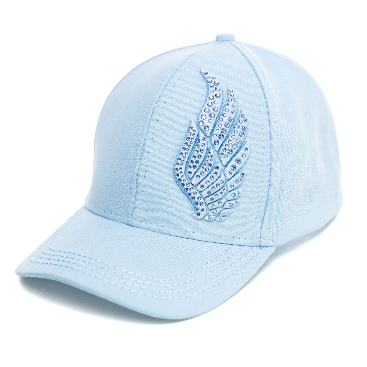 Boné todo em tecido de sarja na cor azul claro bordado em relevo da asa com aplicação de cristais em sobretom.