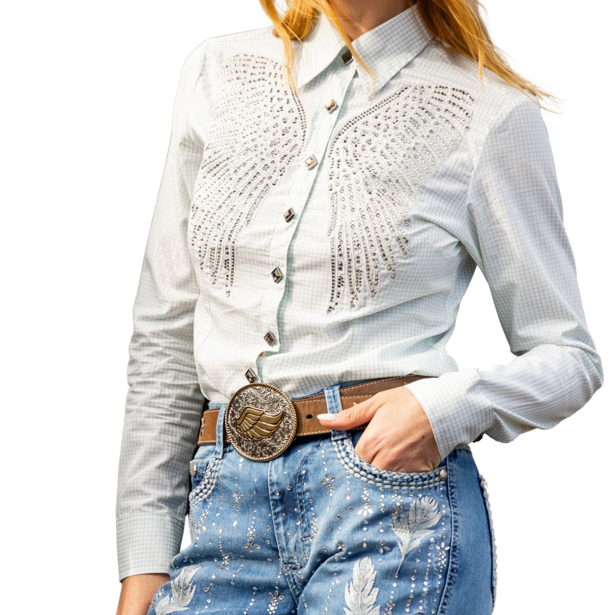 Camisa feminina em tecido xadres verde claro, modelagem acinturada.