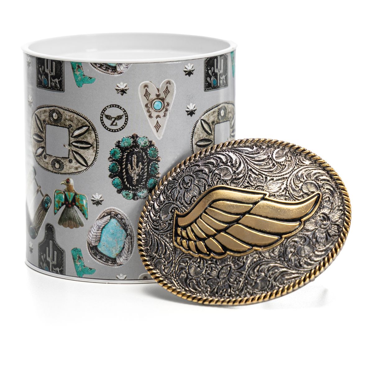 Fivela de metal em formato oval, personalizada com a asa em banho de ouro.