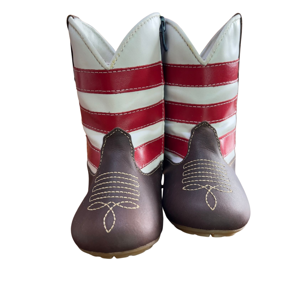 A Bota Texana Infantil Unissex em Couro Cor Fossil Café e Napa Branco, Marinho e Vermelho formando a bandeira Americana - Modelo 1305 | Bili Bilu foi cuidadosamente projetada para proporcionar máximo conforto e segurança aos pezinhos das crianças!