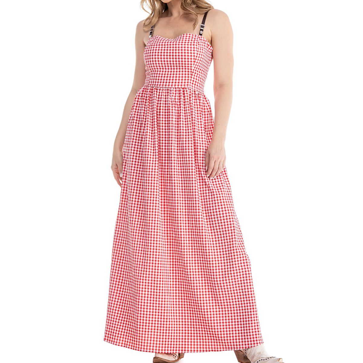 VESTIDO DE COMPRIMENTO LONGO.TECIDO ESTAMPADO XADREZ VERMELHO.